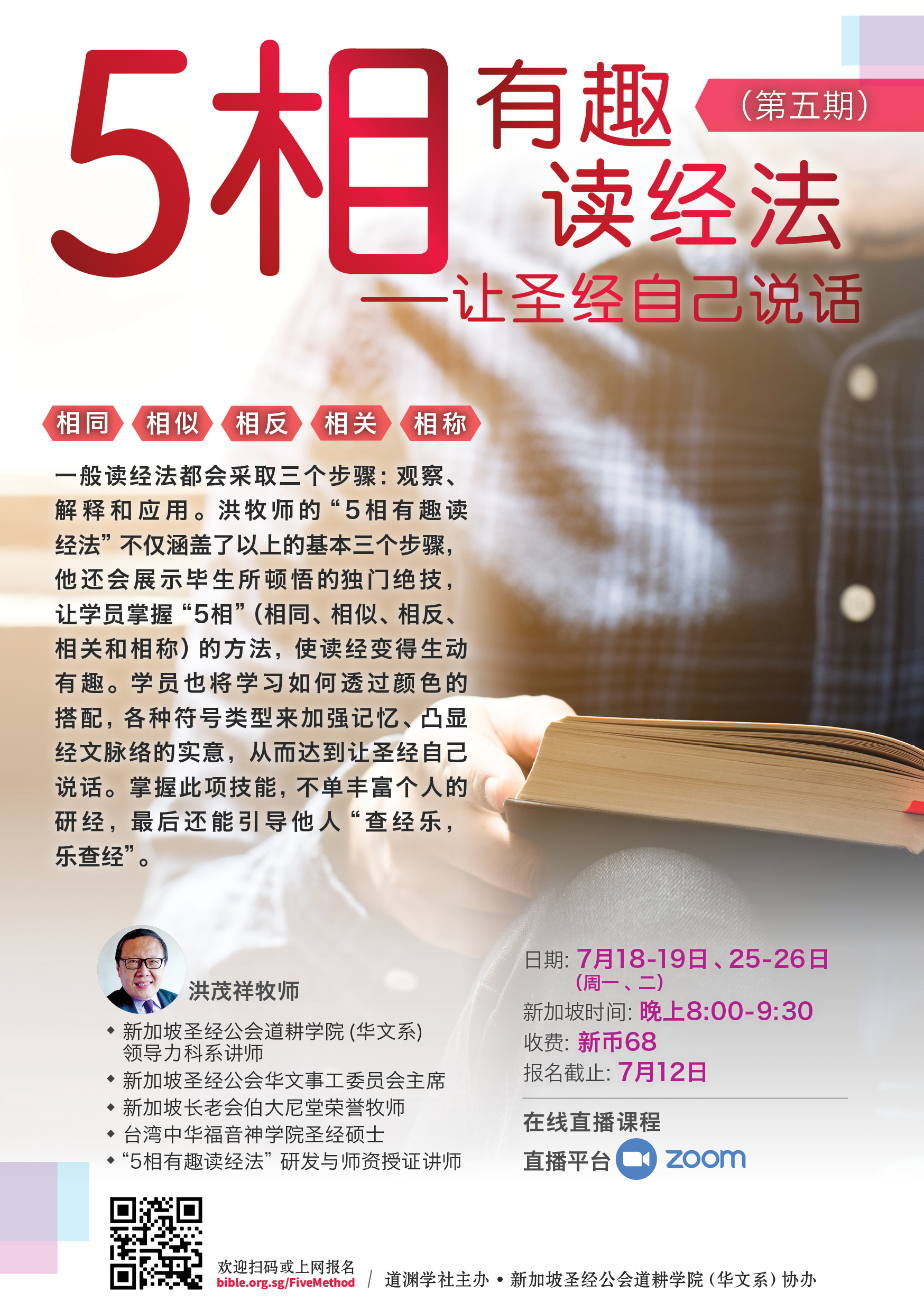 一般读经法都会采取以下的三个步骤:观察、解释、应用。洪牧师的“5相有趣读经法“不仅涵盖了以上的基本三个步骤,他还会展示毕生所领悟的独门绝技,让学员掌握“5相”(相同、相似、相反、相关和相称)的方法,使读经变得生动有趣。学员也将学习如何透过颜色的搭配,各种符号类型来加强记忆、凸显经文脉络的实意,从而达到让圣经自己说话。掌握此项技能,不单丰富个人的研经,最后还能引导他人“查经乐,乐查经”。