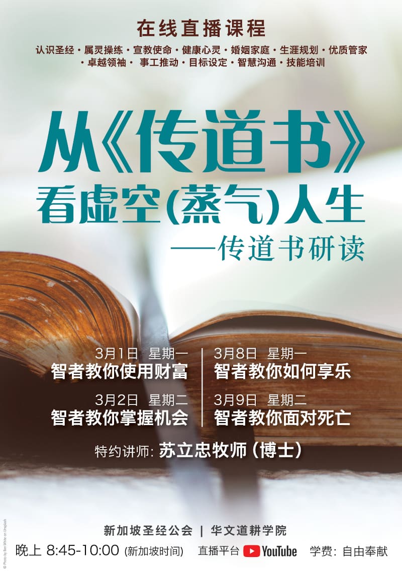 在我们漫长的人生中也总是围绕着财富、享乐、机遇以及生死的问题,本课程将从传道书中探讨如何从圣经的角度来智慧的看待这四方面的问题。让智者带你领略智慧人生,愿你的路径都滴下脂油,活出荣神益人的一生。