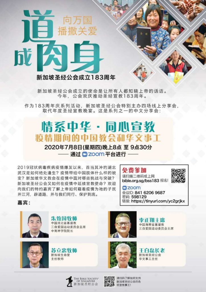 为纪念新加坡圣经公会成立183周年,特别举办线上分享会,主题为“情系中华,同心宣教:疫情时期的中国教会和华文事工”。活动时间为2020年7月8日(星期三)晚上8点至9点半,通过Zoom平台进行,活动免费。