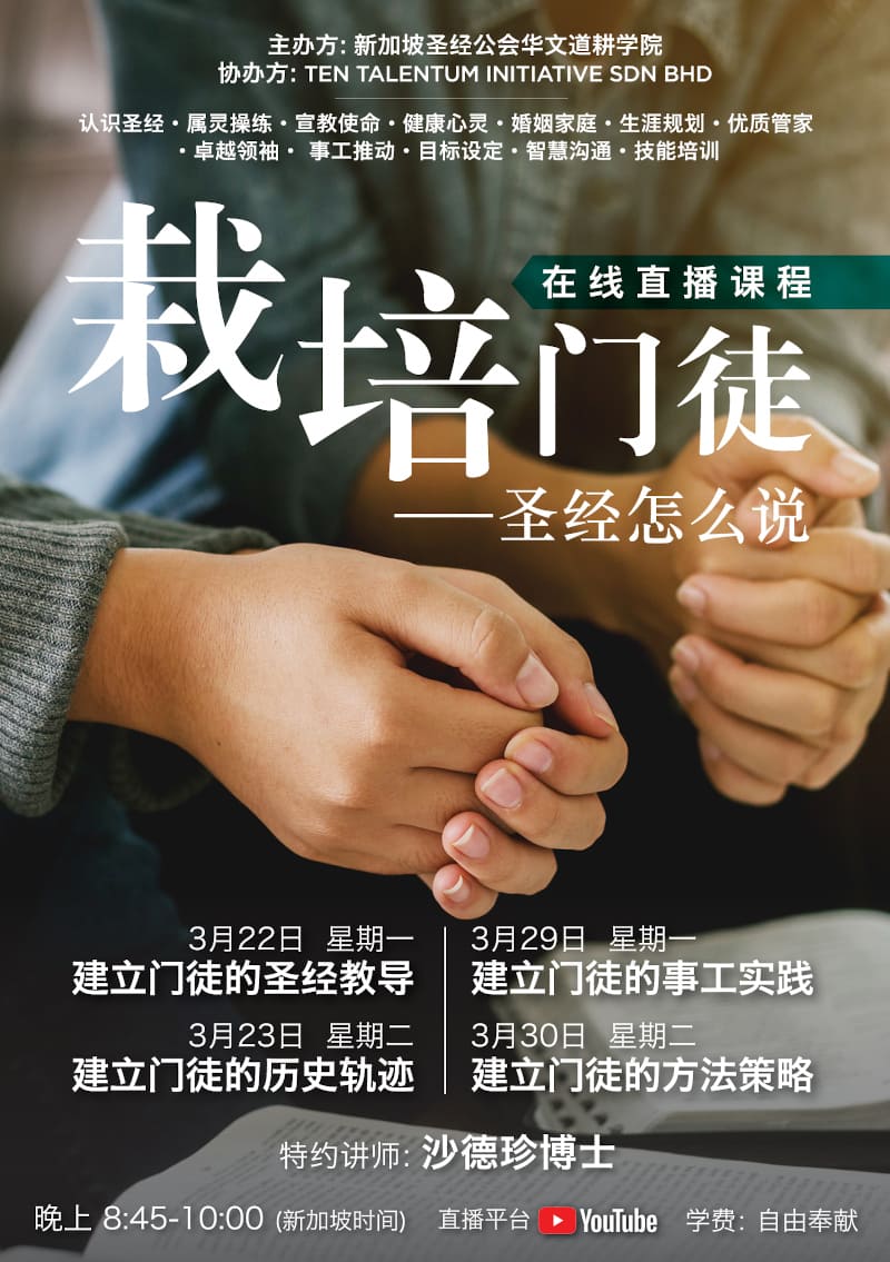 本课程主要探讨如何帮助别人成为耶稣基督的门徒。学员透过从圣经、神学、历史、会众处境等研究中,了解有关栽培基督门徒的重要因素。本课期望能够帮助学员,自己迈向成熟门徒路径的同时,并按着其独特处境,建立个人的门徒训练策略及方法,使万民成为主的门徒。