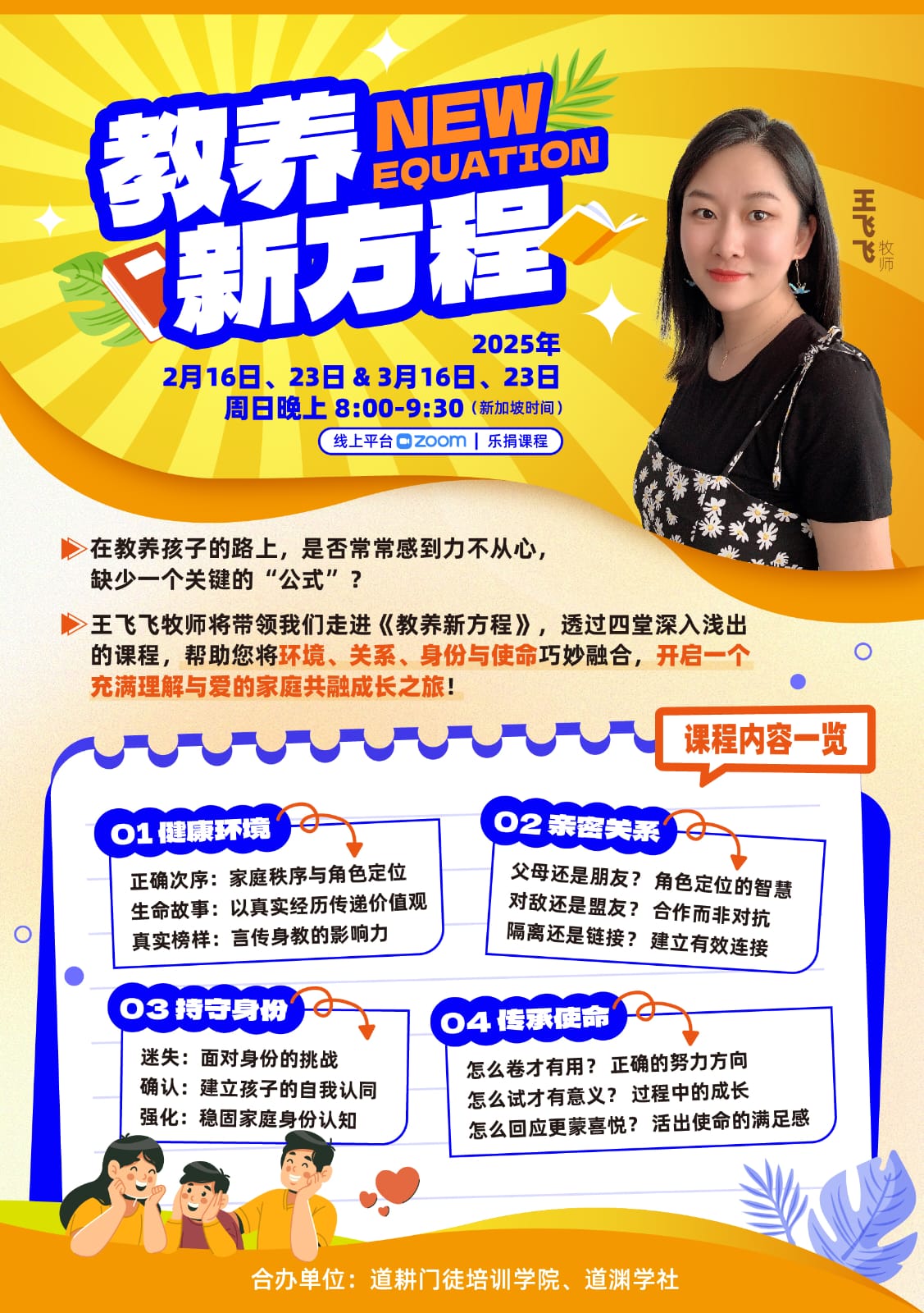 王飞飞牧师将带领我们走进《教养新方程》,透过四堂深入浅出的课程,帮助您将环境、关系、身份与使命巧妙融合,开启一个充满理解与爱的家庭共融成长之旅!