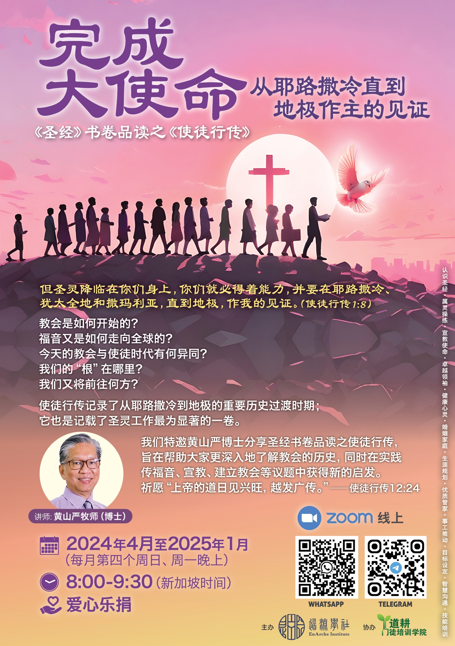 我们特邀黄山严博士分享圣经书卷品读之使徒行传,旨在帮助大家更深入地了解教会的历史,同时在实践传福音、宣教、建立教会等议题中获得新的启发。祈愿“上帝的道日见兴旺,越发广传。”——使徒行传12:24