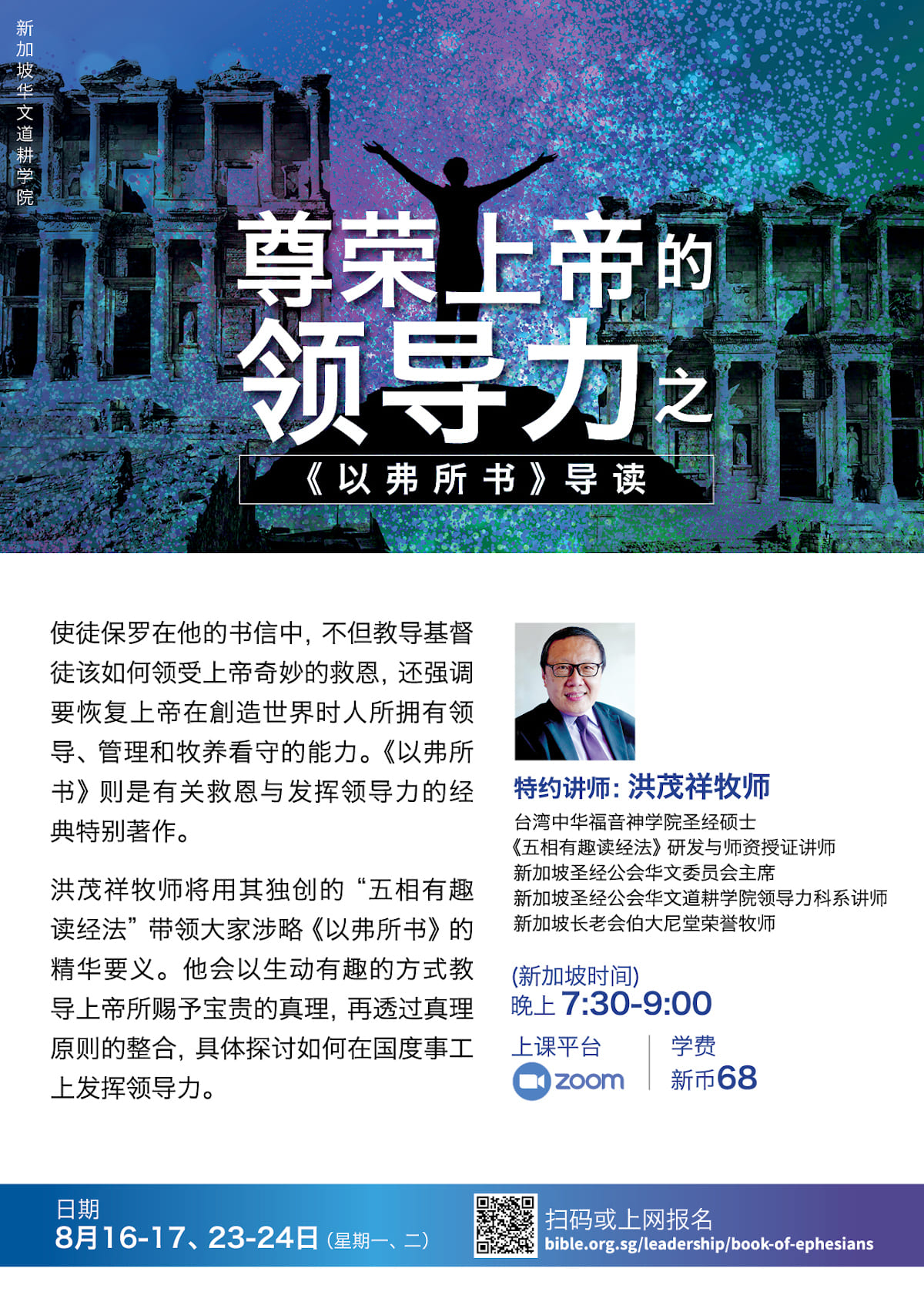 洪茂祥牧师将在本次课程用其独创的“五相有趣读经法”带领大家涉略《以弗所书》的精华要义。他会以生动有趣的方式教导上帝所赐予宝贵的真理,再透过真理原则的整合,具体探讨如何在国度事工上发挥领导力。
