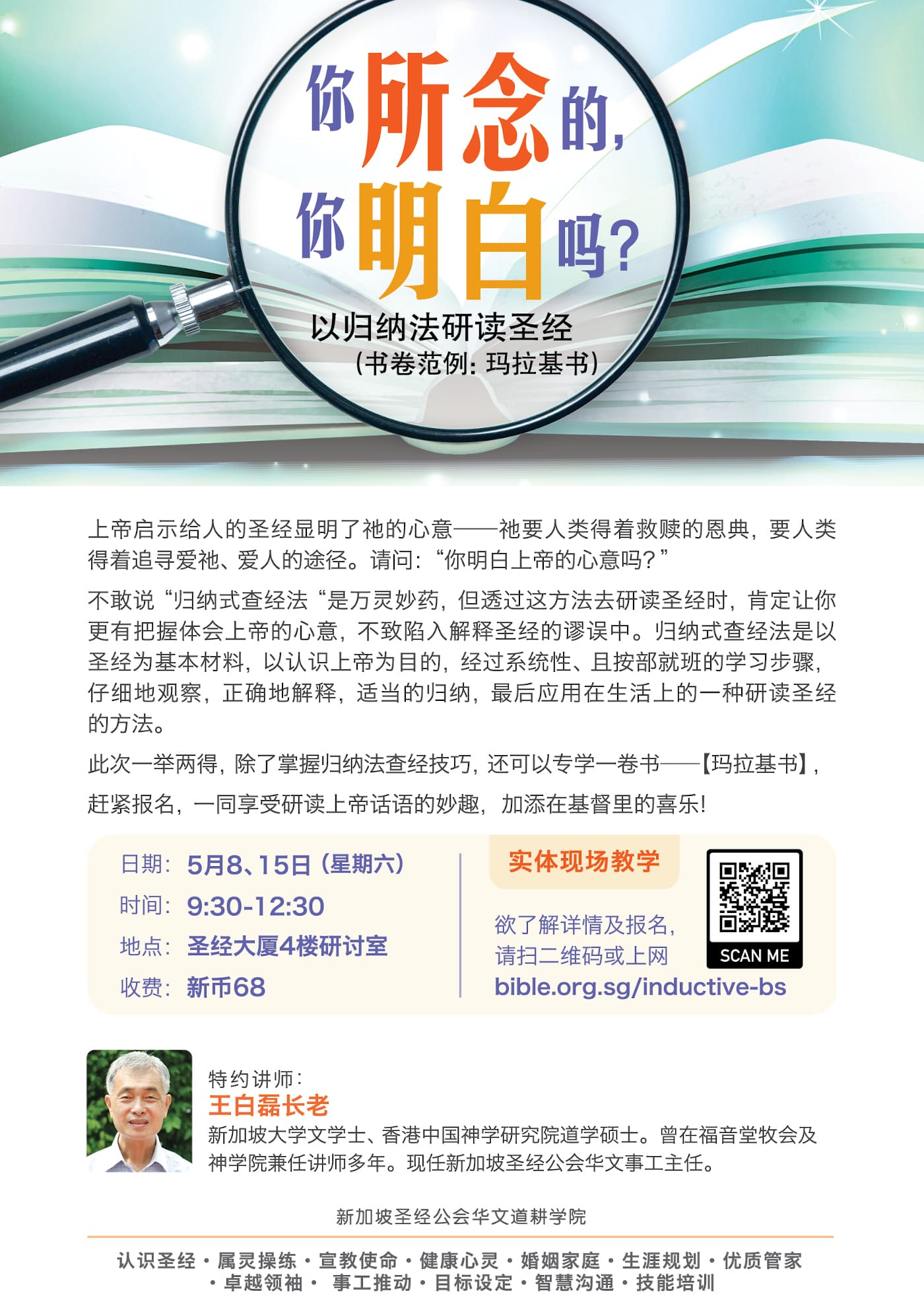 此次一举两得,除了掌握归纳法查经技巧,还可以专学一卷书—【玛拉基书】,赶紧报名,一同享受研读上帝话语的妙趣,加添在基督里的喜乐!