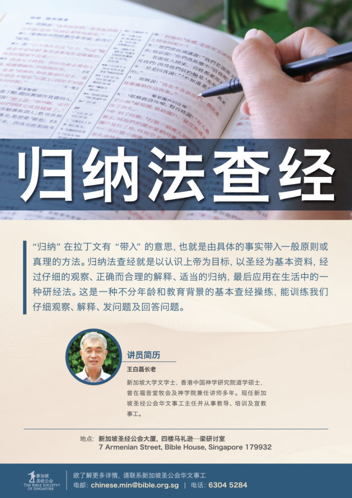 归纳”在拉丁文有“带入”的意思,也就是由具体的事实带入一般原则或真理的方法。归纳法查经就是以认识上帝为目标,以圣经为基本资料,经过仔细的观察、正确而合理的解释、适当的归纳,最后应用在生活中的一种研经法。这是一种非常重要的基本查经操练,能训练我们仔细观察、解释、发问题及回答问题。