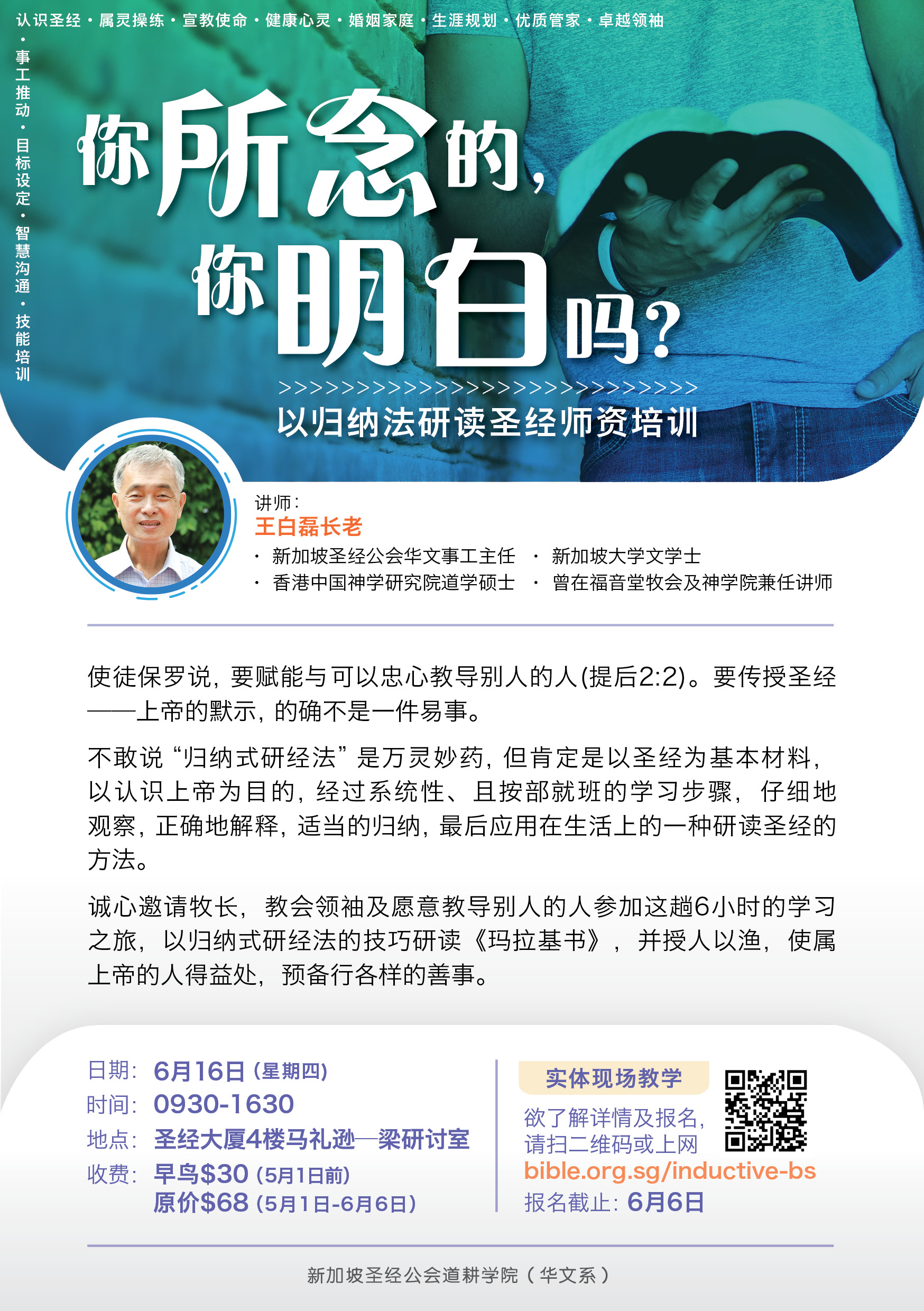 诚心邀请牧长,教会领袖及愿意教导别人的人参加这趟6小时的学习之旅,以归纳式研经法的技巧研读《玛拉基书》,并授人以渔,使属上帝的人得益处,预备行各样的善事。