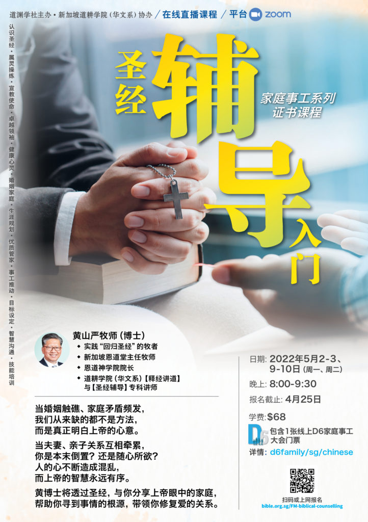 2022年5月10日 (星期二) 20:00 – 21:30课程费用: $68 (包含1张线上D6家庭事工大会门票)报名截止日期: 2022年4月25日欢迎您参加我们线上课程,也推荐基督徒朋友一起加入。* 在向我们提供您个人资料的同时,就表示您已同意让新加坡圣经公会和属下的各项事工按照本会网页上的隐私政策来收集、使用您的个人信息数据。我们会竭力只在所需的范围内使用所收集的数据。