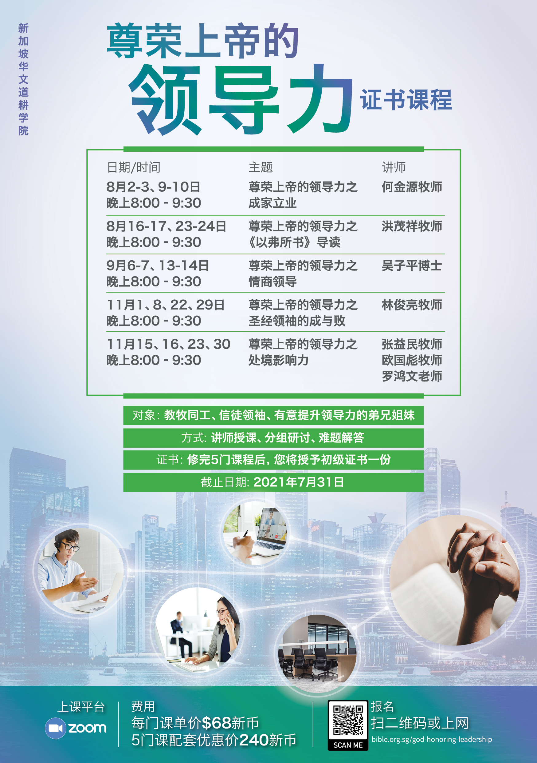 新加坡圣经公会华文道耕学院全新打造,特别推出“尊荣上帝的领导力”证书课程。本课程的目的是为了陪导提升具备有影响力和有使命感的国度精兵;为创建优秀团队及实现可持续发展,而愿意为之付出,并不断学习成长的卓越领袖。我们坚信,无论你目前处在什么位置,你的领导力是倾向掌控、影响、稳健还是服从的行为风格,通过这次有效的学习、交流和培训,都可以在领导力的领域中不断取得优质的成果,并在合神心意的事工上提升格局与境界。