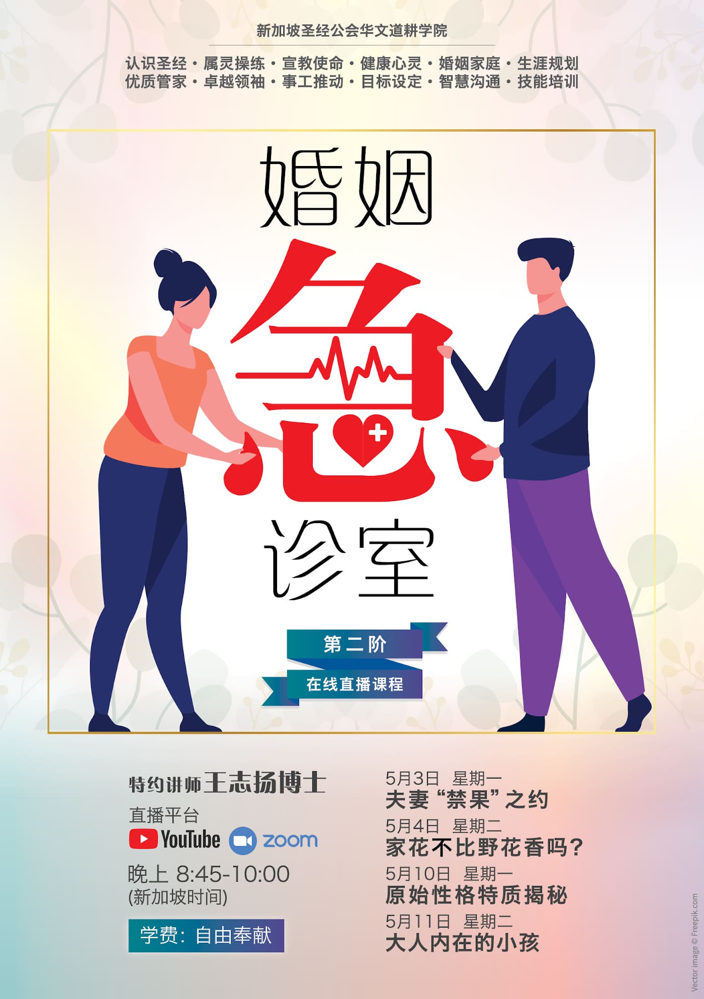 课堂上,讲师将诠释“圣经对性“的解读,针对社会对性开放与性扭曲的纠正与整合;探讨夫妻两性之间潜伏EQ危机、中年男性外展内忧、两性对立与外展的试探、修补“情”的破口与治疗;引导学员认识原始性格特质如何制造彼此互动的情感与思维冲突,了解彼此,以性格特质为基础,以价值观共享来营造婚姻的祝福;探索婚姻内在“小孩的情伤“,注视EQ情绪的向度,寻找记忆及情感伤痛的治疗与包裹的途径。
