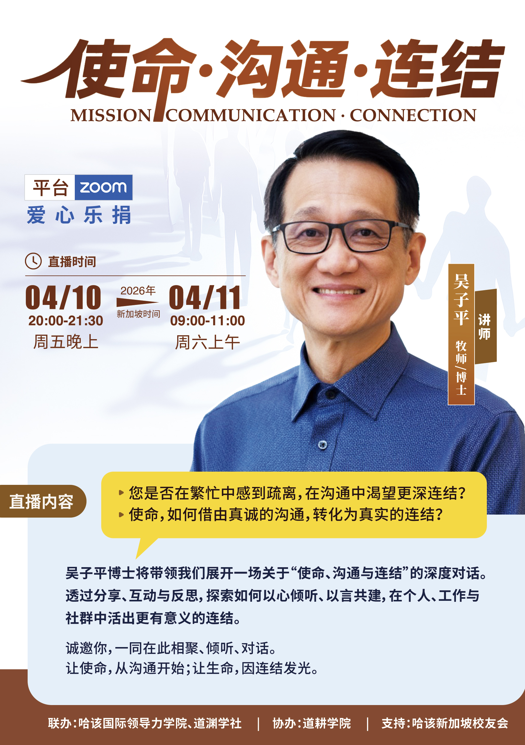 吴子平博士将带领我们展开一场关于“使命、沟通与连结”的深度对话。