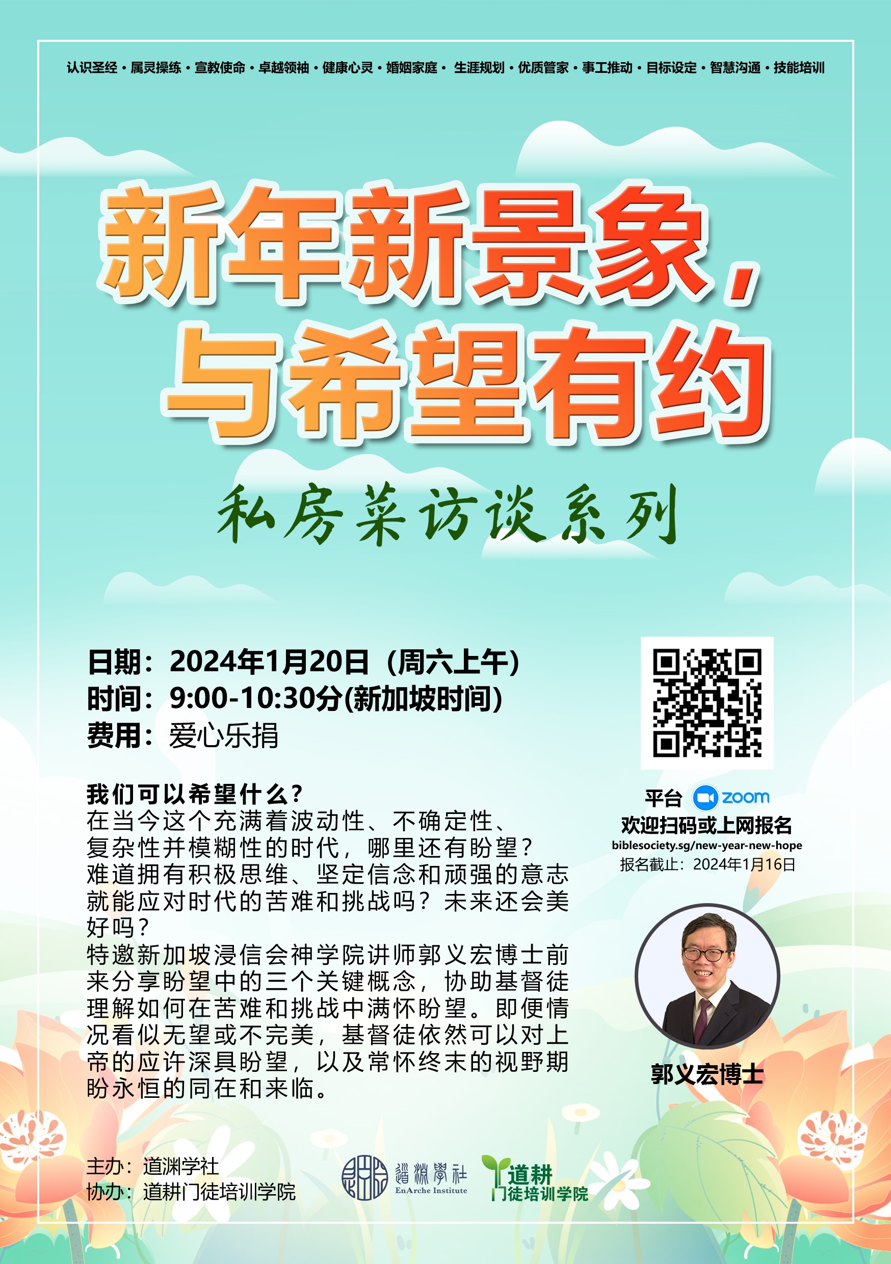 来自新加坡浸信会神学院讲师郭义宏博士将特别分享盼望中的三个关键概念,协助基督徒理解如何在苦难和挑战中满怀盼望。即便情况看似无望或不完美,基督徒依然可以对上帝的应许深具盼望,以及常怀终末的视野期盼永恒的同在和来临。