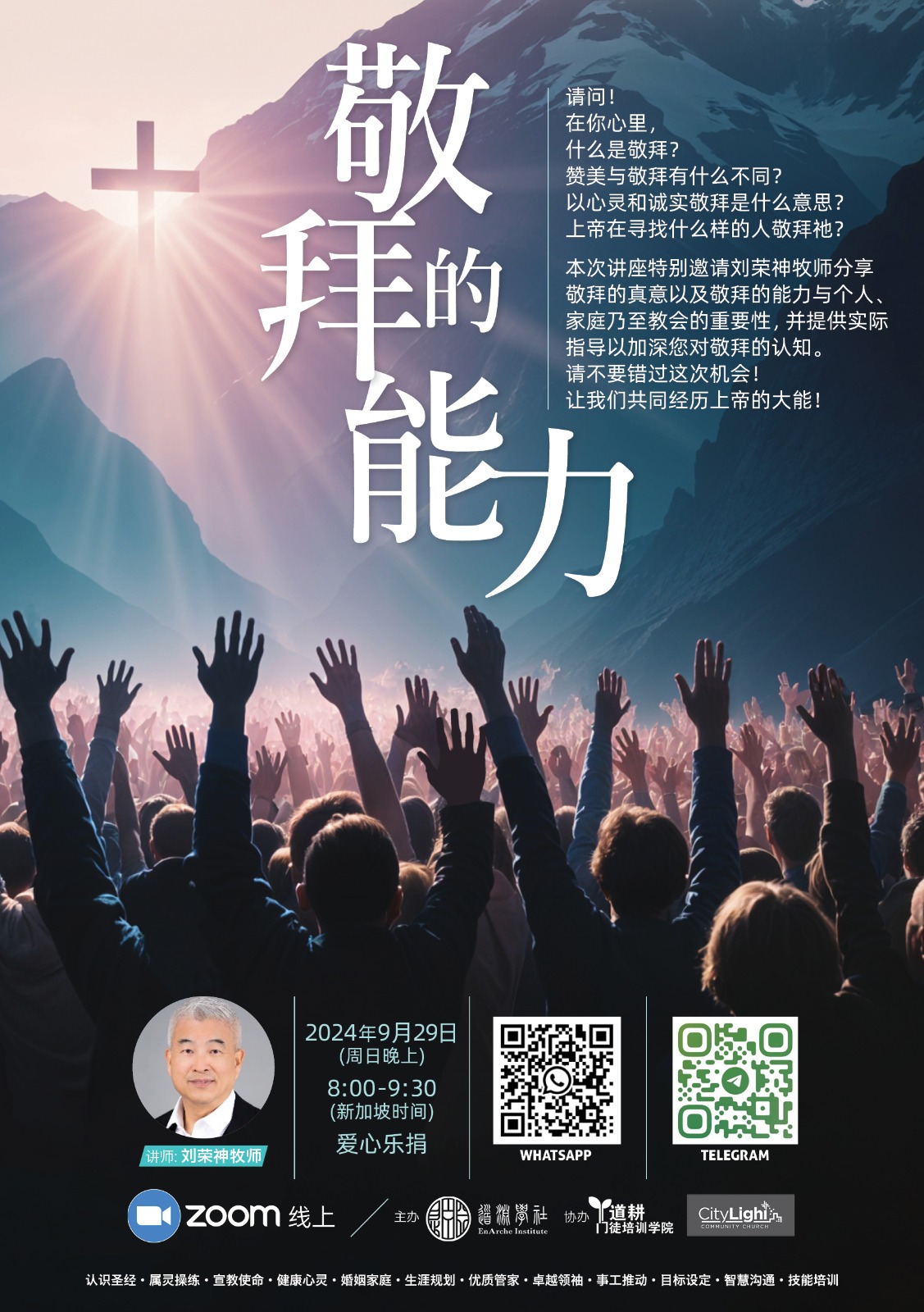 本次讲座特别邀请刘荣神牧师分享敬拜的真意以及敬拜的能力与个人、家庭乃至教会的重要性,并提供实际指导以加深您对敬拜的认知。