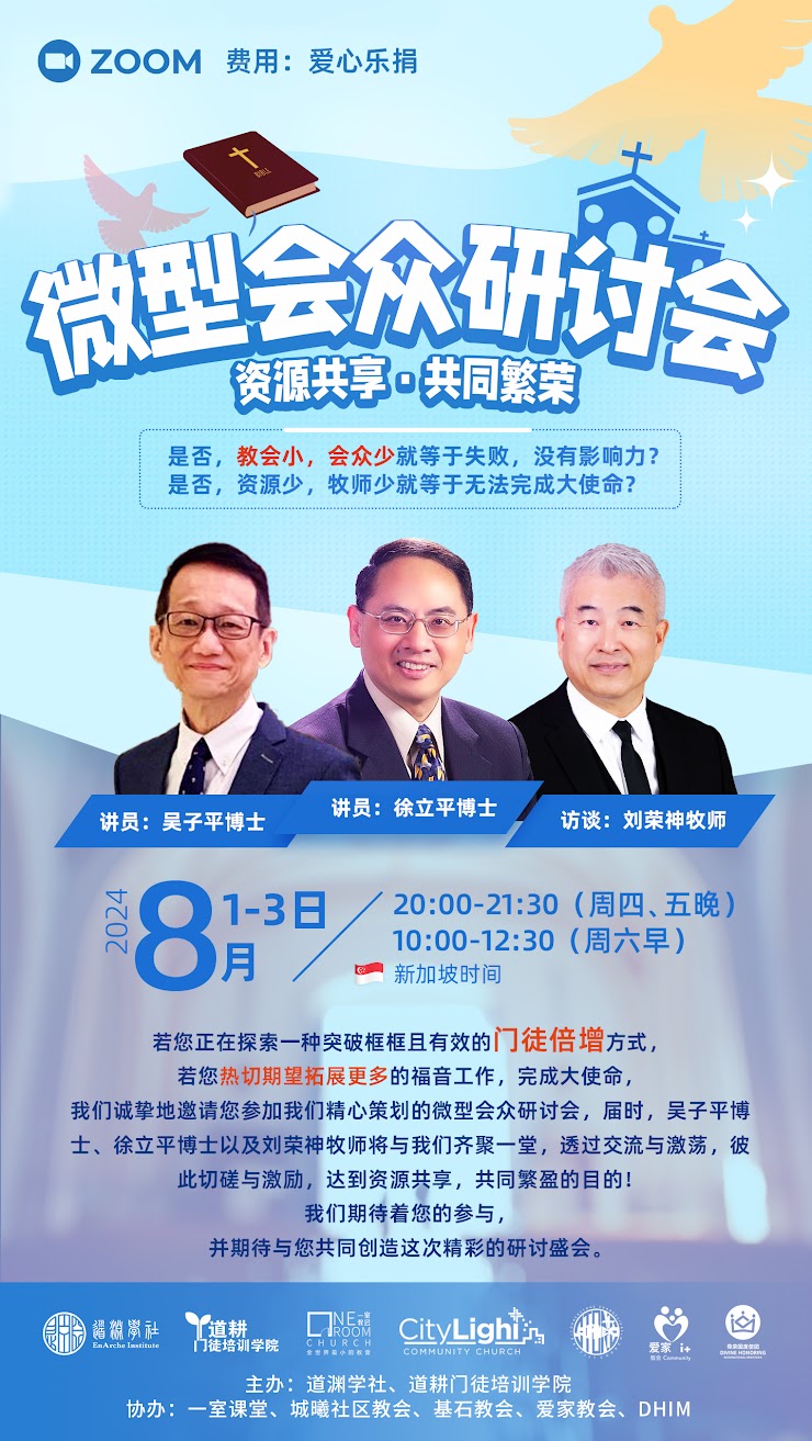 我们诚挚地邀请您参加我们精心策划的微型会众研讨会,届时,吴子平博士、徐立平博士以及刘荣神牧师将与我们齐聚一堂,透过交流与激荡,彼此切磋与激励,达到资源共享,共同繁盈的目的!