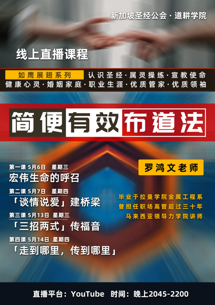 在『简便有效布道法』这门课程中,罗老师从「宏伟生命的呼召」、「谈情说爱建桥梁」、「三招两式传福音」和「走到哪里传到哪里」四节课里,向学员们分享传福音的简便技巧。