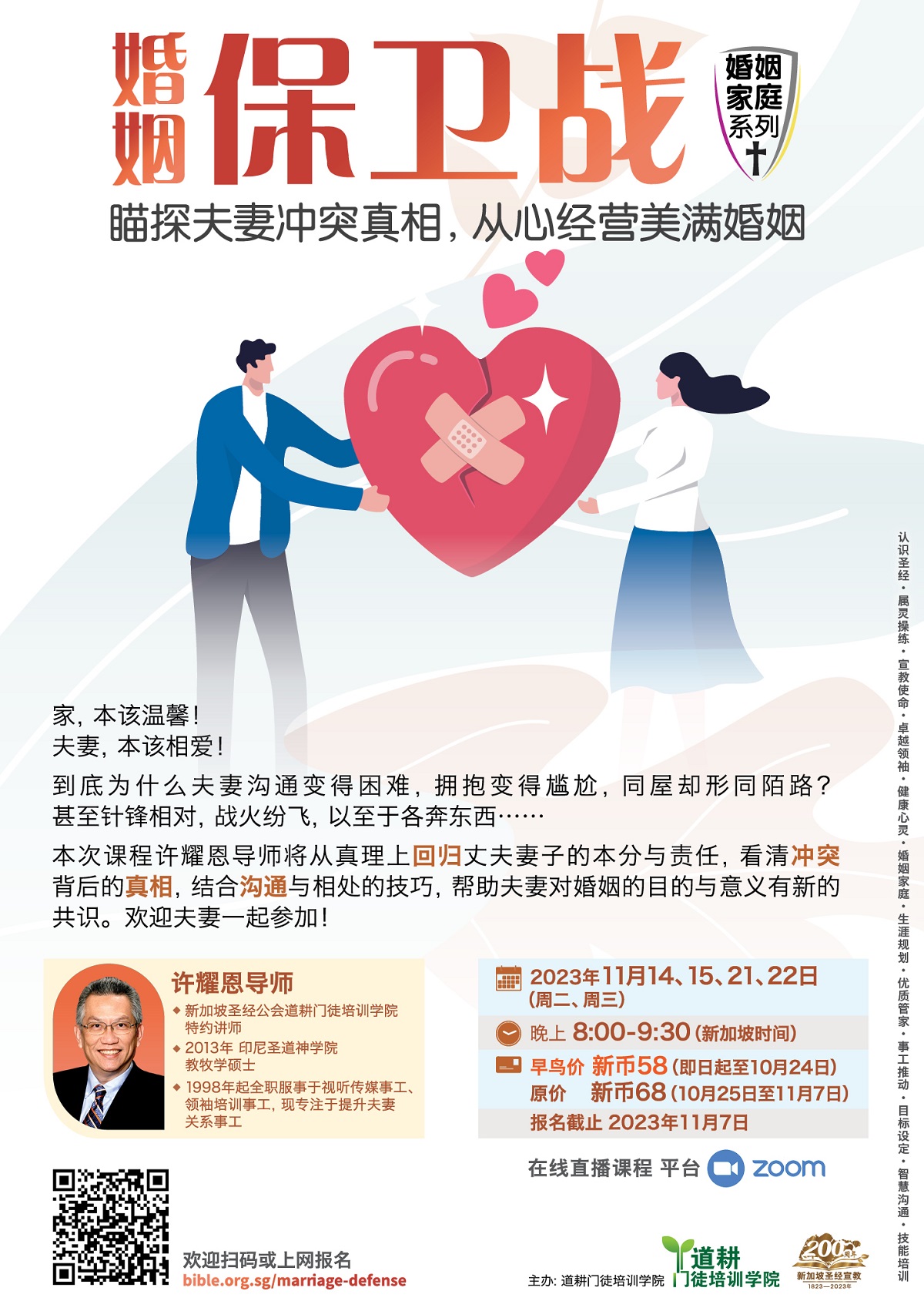 本次课程许耀恩导师将从真理上回归丈夫妻子的本分与责任,看清冲突背后的真相,结合沟通与相处的技巧,帮助夫妻对婚姻的目的与意义有新的共识。欢迎夫妻一起参加!