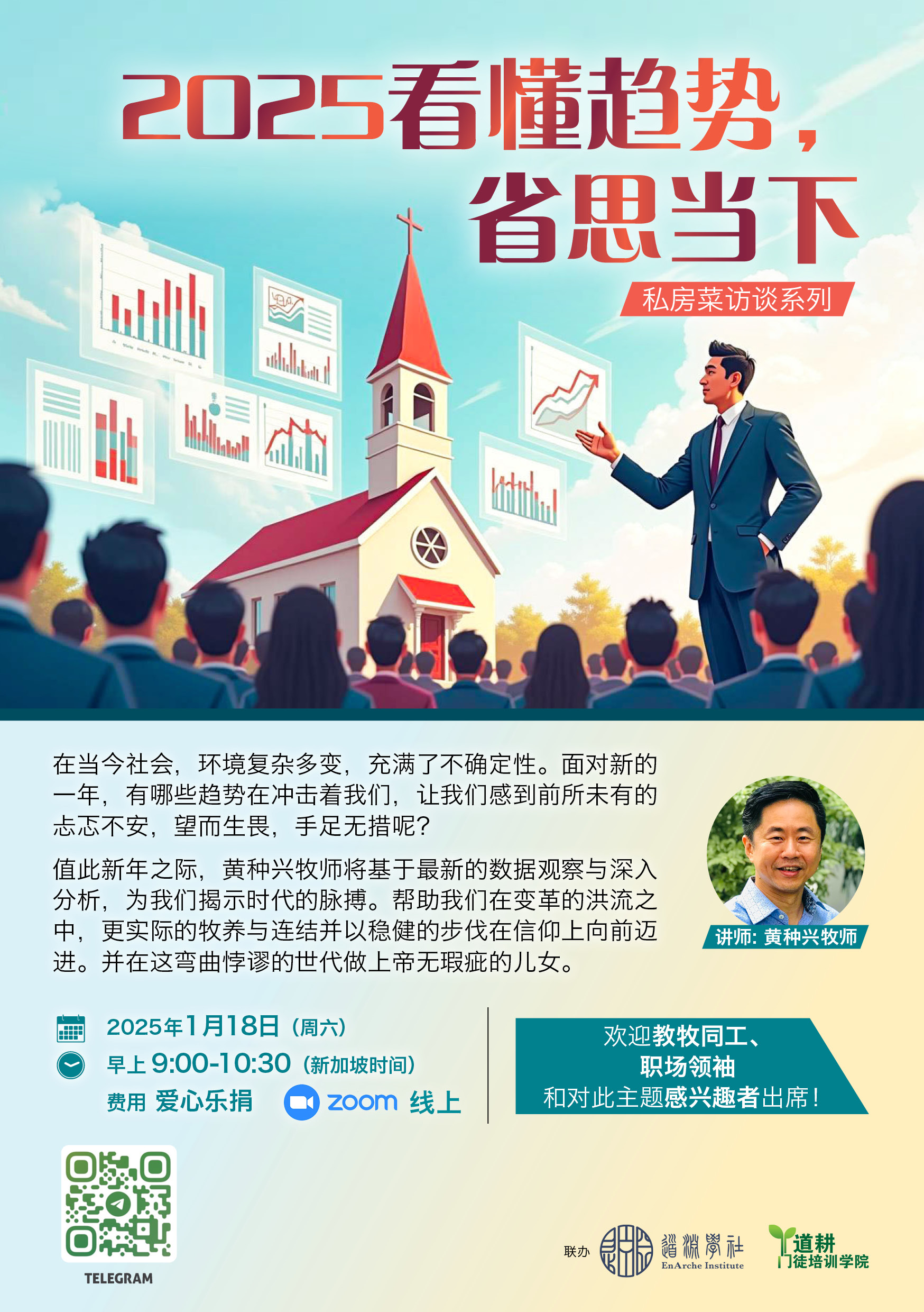 值此新年之际,黄种兴牧师将基于最新的数据观察与深入分析,为我们揭示时代的脉搏。帮助我们在变革的洪流之中,更实际的牧养与连结并以稳健的步伐在信仰上向前迈进。并在这弯曲悖谬的世代做上帝无瑕疵的儿女。
