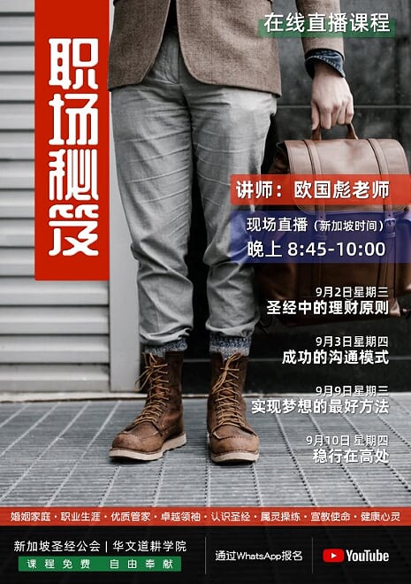 职场有退休,使命无终点。在事业上,我们有各行各业的选择,也发挥我们每个人不同的恩赐,但在践行使命、服侍上帝的道路上,永远都不能偏离始终如一的基督大使命。职场秘笈系列以圣经教导为基础,结合时代职场特点及需求,教导职场基督徒明白上帝旨意,并在职场中践行上帝的使命,从而获得从上帝而来的丰盛资源。